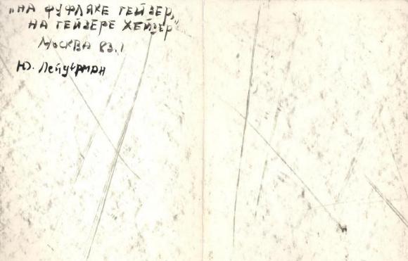Юрій Лейдерман На фуфляці гейзер, на гейзері хейзер 1983 Інші твори автора Юрій Лейдерман Курочки 1980 Юрій Лейдерман Ульріх 1986 Юрій Лейдерман В облом так тремтіти 1982 Юрій Лейдерман На хейзері кактус, на кактусі Fluxsus 1983 Юрій Лейдерман Без назви (вірш) 1989 Юрій Лейдерман Без назви (вірш) 1989 Показати усі