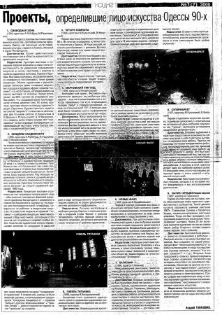 Андрій Тараненко Проєкти, які визначили обличчя мистецтва Одеси 1990-х 2000 Пов'язані проєкти Супермаркет Сичик+Хрущик. Нова версія Виставка сучасного візуального мистецтва "Новий файл" Загибель Титаніка Проєкт "4 кімнати" Синдром Кандинського (перша частина виставкового триптиха) Показати усі